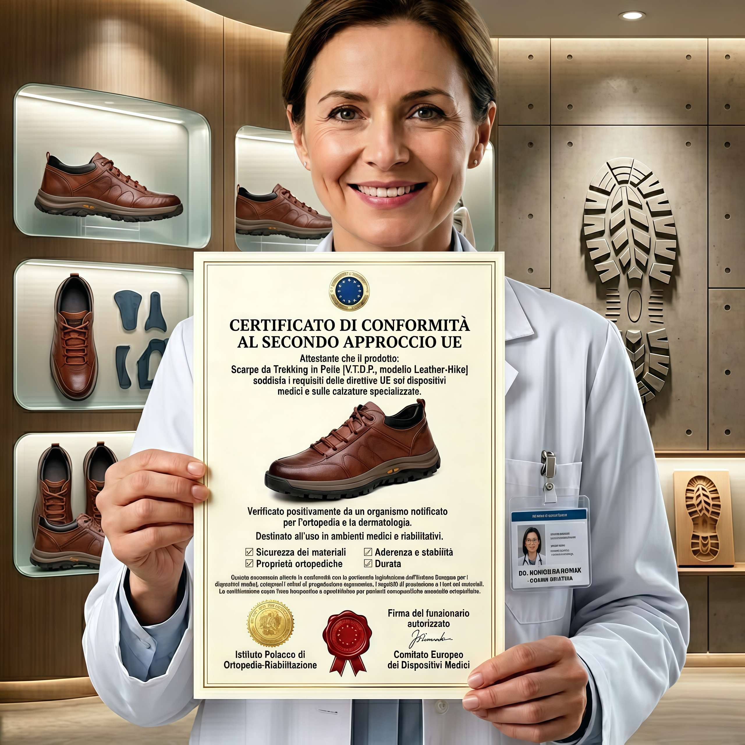 🩺 Certificazione UE e approvazione medica: Le nostre calzature sono dotate del certificato di conformità CE europeo. Ogni modello è stato testato ortopedicamente ed è raccomandato da specialisti in tutta l'Unione Europea come prodotto a supporto della salute del piede.