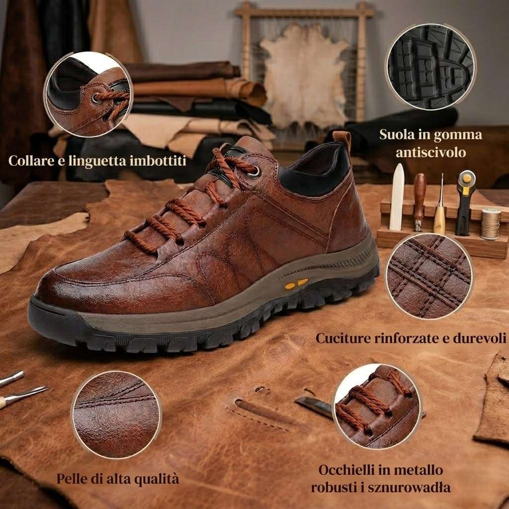 La tomaia è realizzata in pregiata pelle bovina italiana: morbida, flessibile e progettata per adattarsi perfettamente ai contorni del piede. Questo materiale non è solo durevole e resistente all'usura, ma vanta anche un'eccezionale traspirabilità, garantendo che i piedi rimangano comodi e asciutti, anche durante lunghi periodi di cammino.